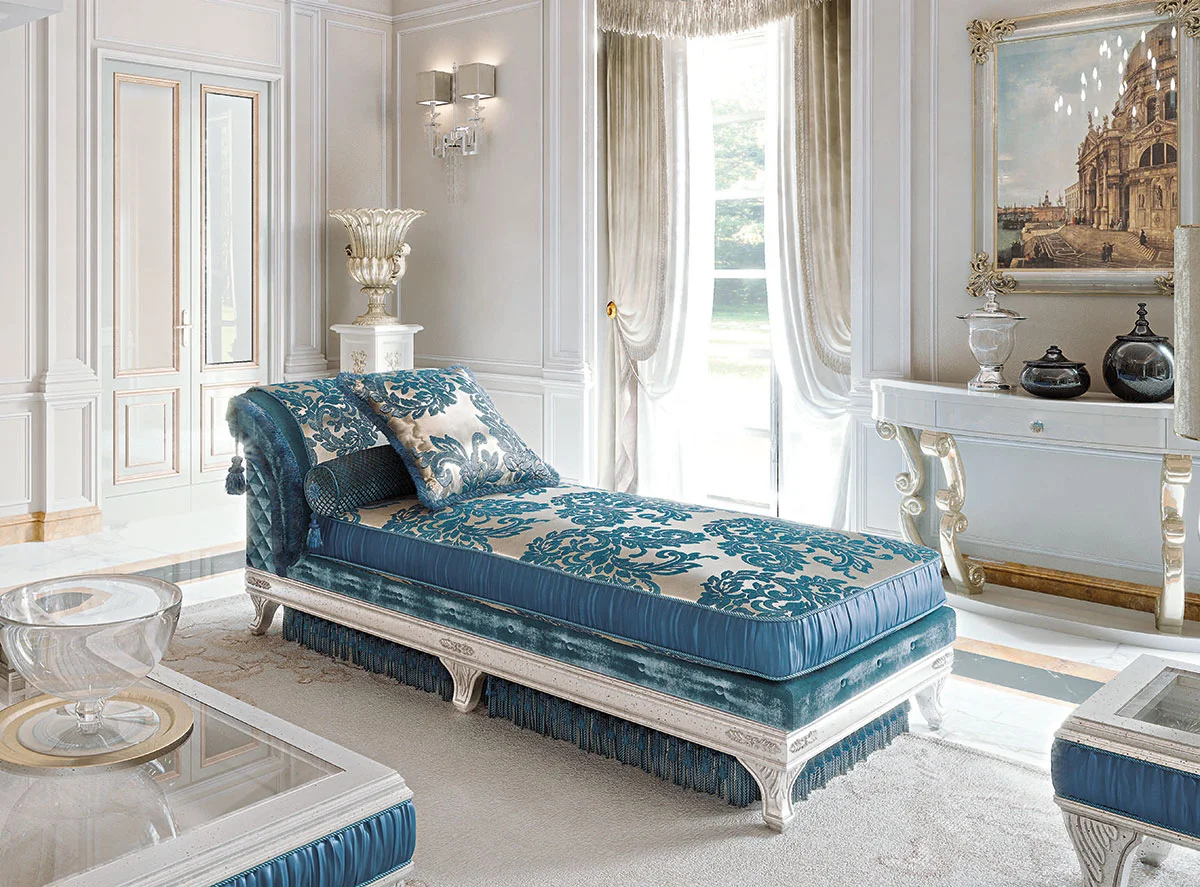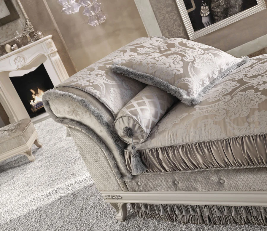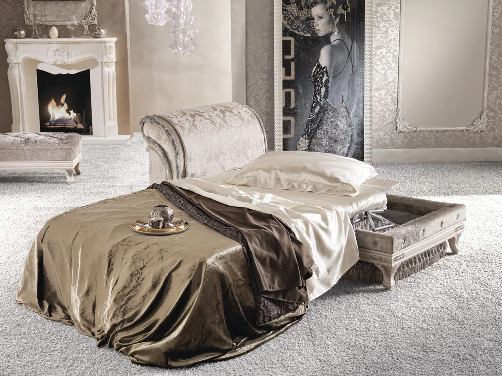 Choice of brush and classic cord finishes. Choice of gold or silver leaf finish at extra charge. In questo modello è prevista la versione letto con la sola rete elettrosaldata di serie con materasso H 11 in poliuretano ad alta densità 50 indeformabile con guscio in Aloe sfoderabile e lavabile.