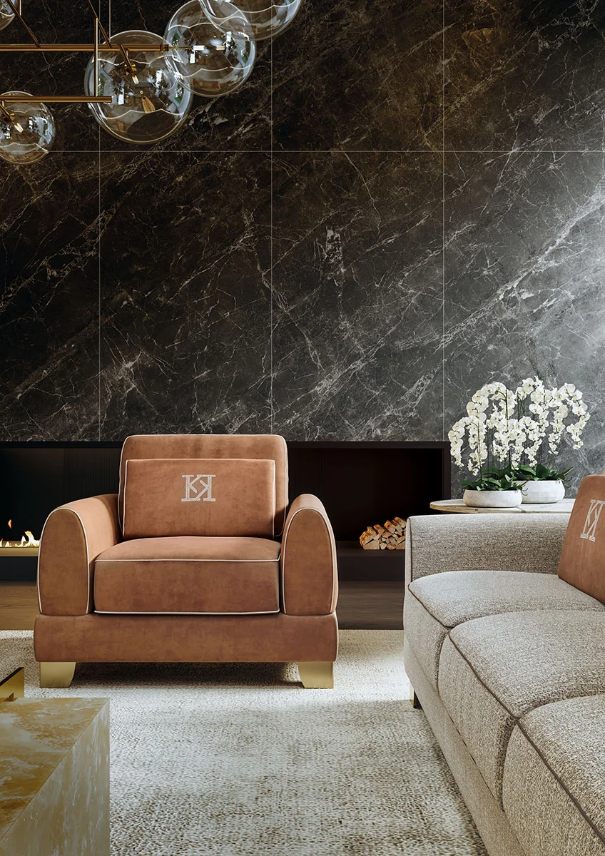 The feet in steel with polished or matt chrome are included in the price, for all other finishes surcharge as per price list is to be considered. The KK embroidery on the front The KK embroidery on the front cushions is subject to a surcharge as per price list. Mattress in polyurethane foam h 14 cm.