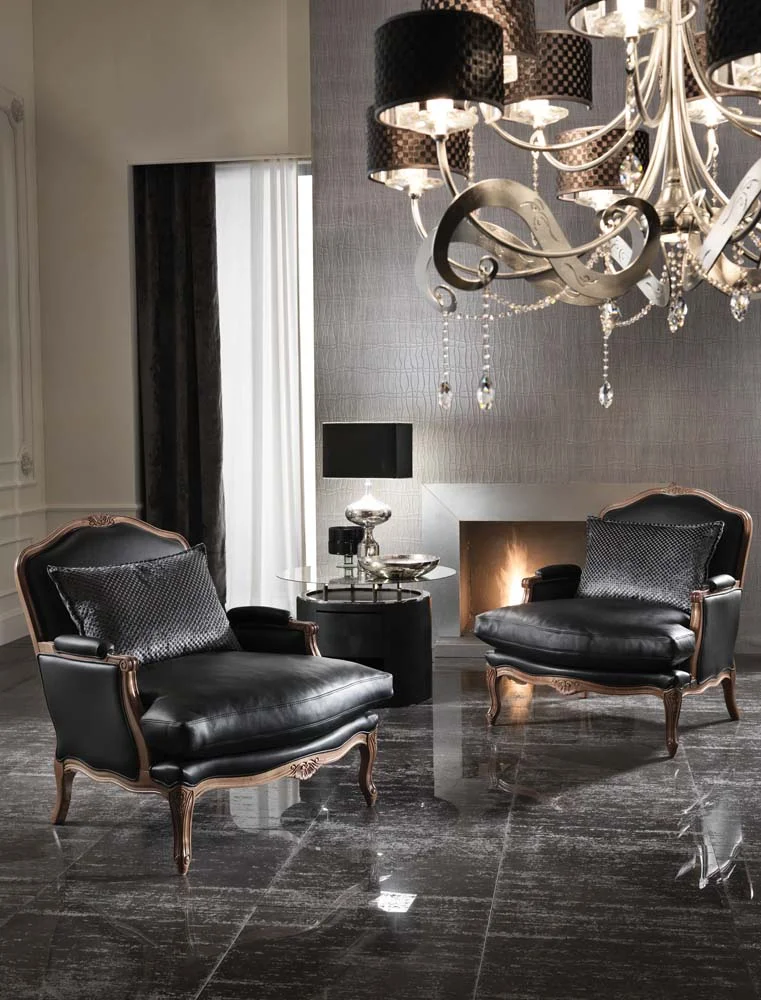 Armchair with partially removable cover. Beechwood frame with hand-carved and hand-finished parts. Upholstery in non-deformable polyurethane foam in different densities, seat cushion and lumbar support padded with goose down.