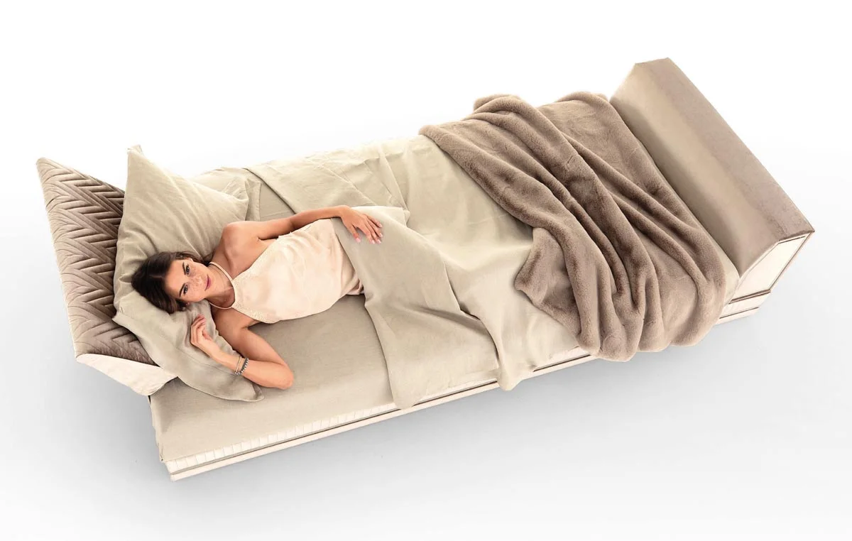 Feather cushions, brushed stainless steel base, removable and interchangeable backrests with relax mechanism are standard.