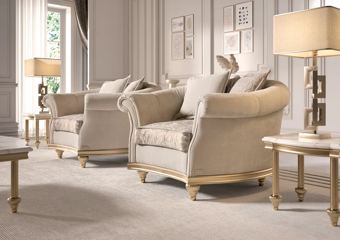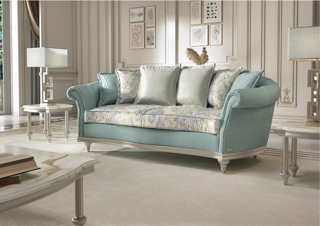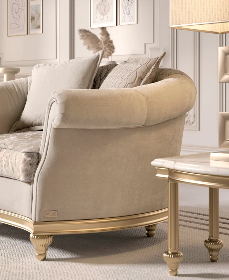 Fusto in legno di abete, faggio e multistrato di pioppo. L'imbottitura in poliuretano espanso indeformabile a quote differenziate.