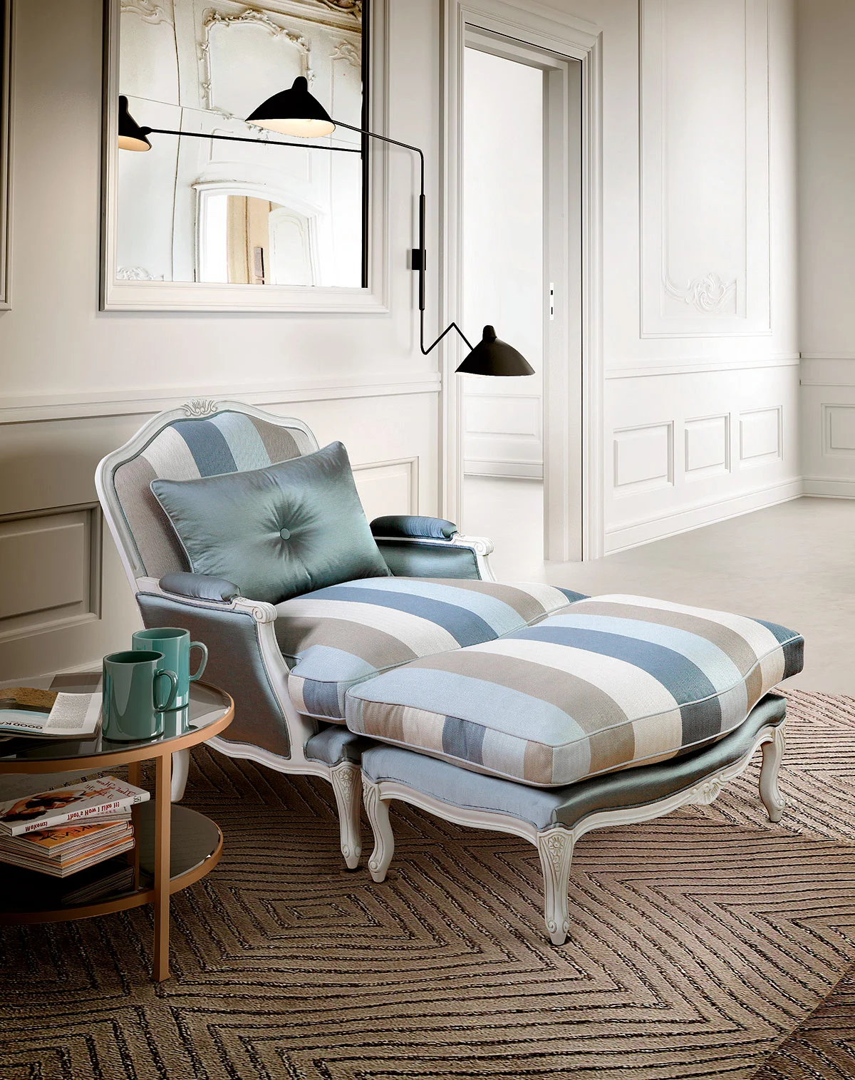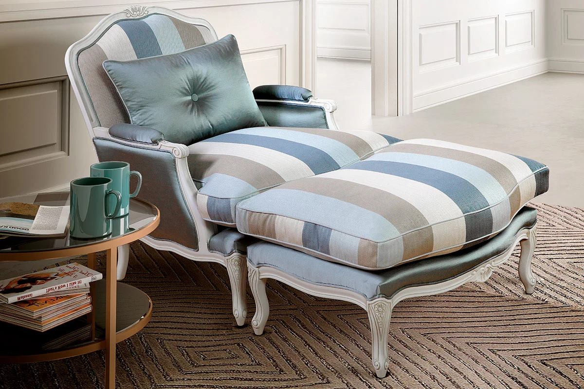 Poltrona con struttura in legno di faggio pantografata ed intagliata a mano. Imbottitura in poliuretano espanso indeformabile.