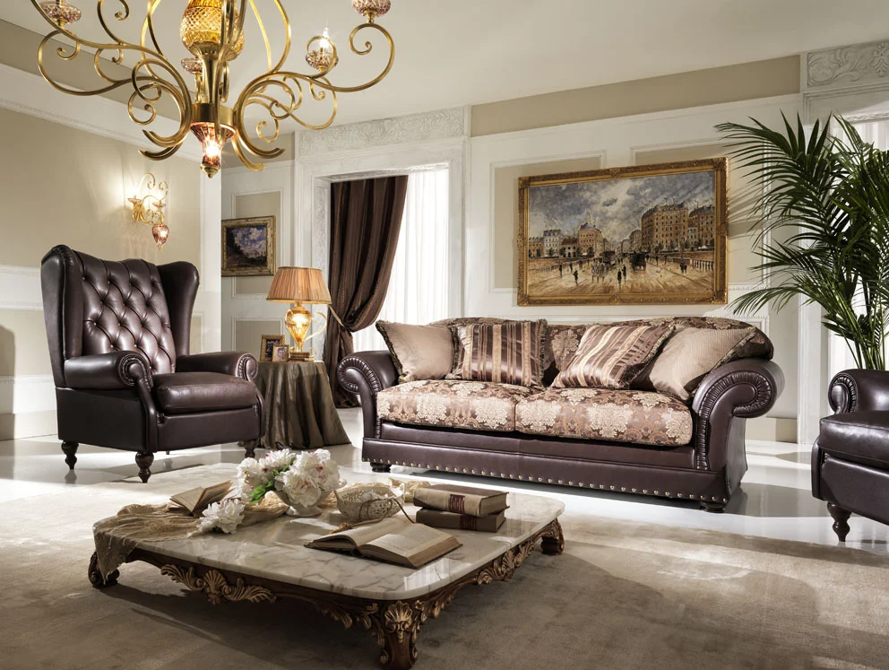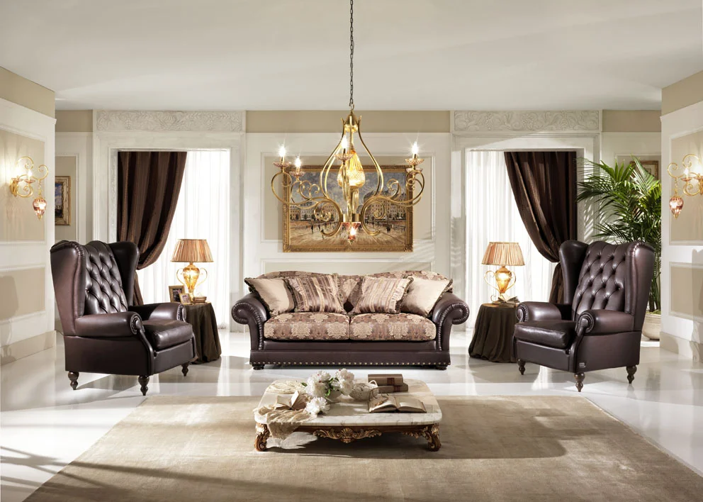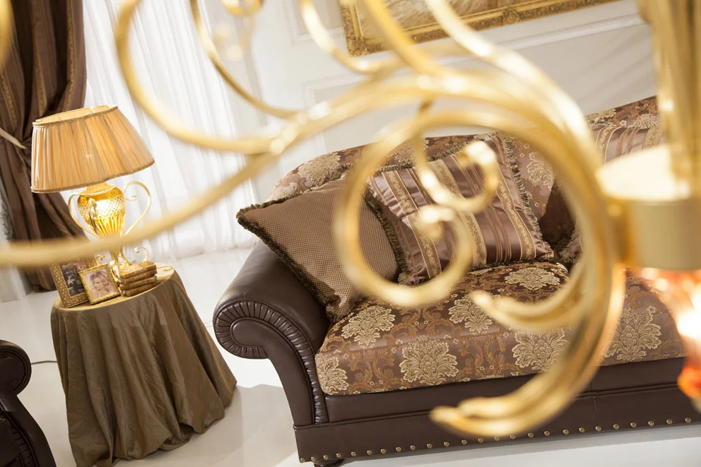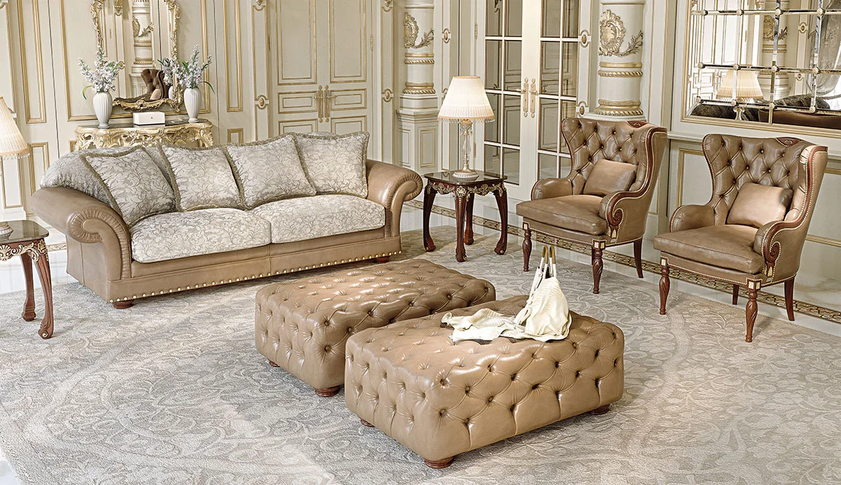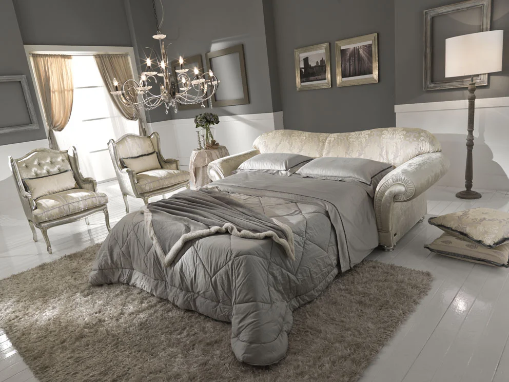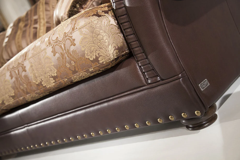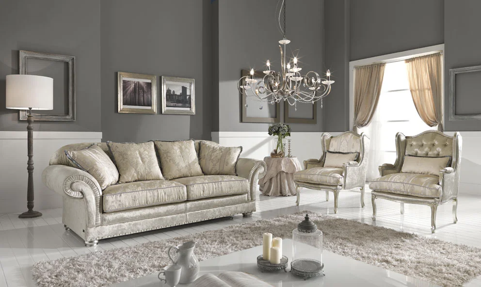Dalla linea classica intramontabile, raffinato nei dettagli ed elegante nei volumi, come ad esempio negli ampi braccioli a voluta con fine plissettatura, uniti allo schienale, finemente lavorati a mano.