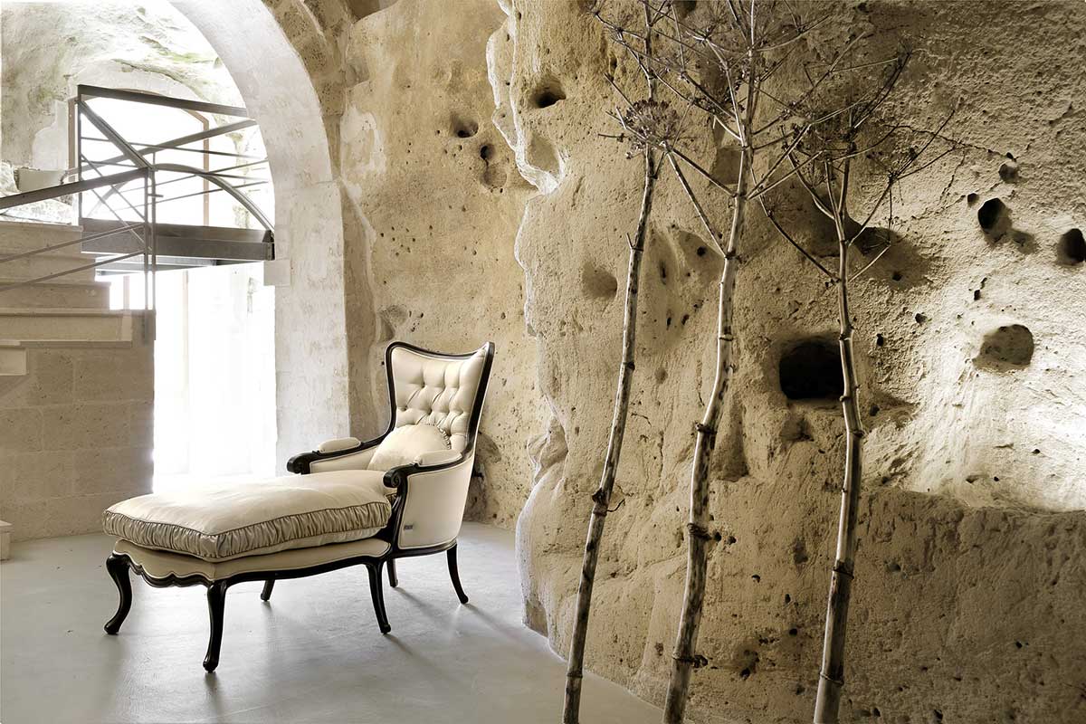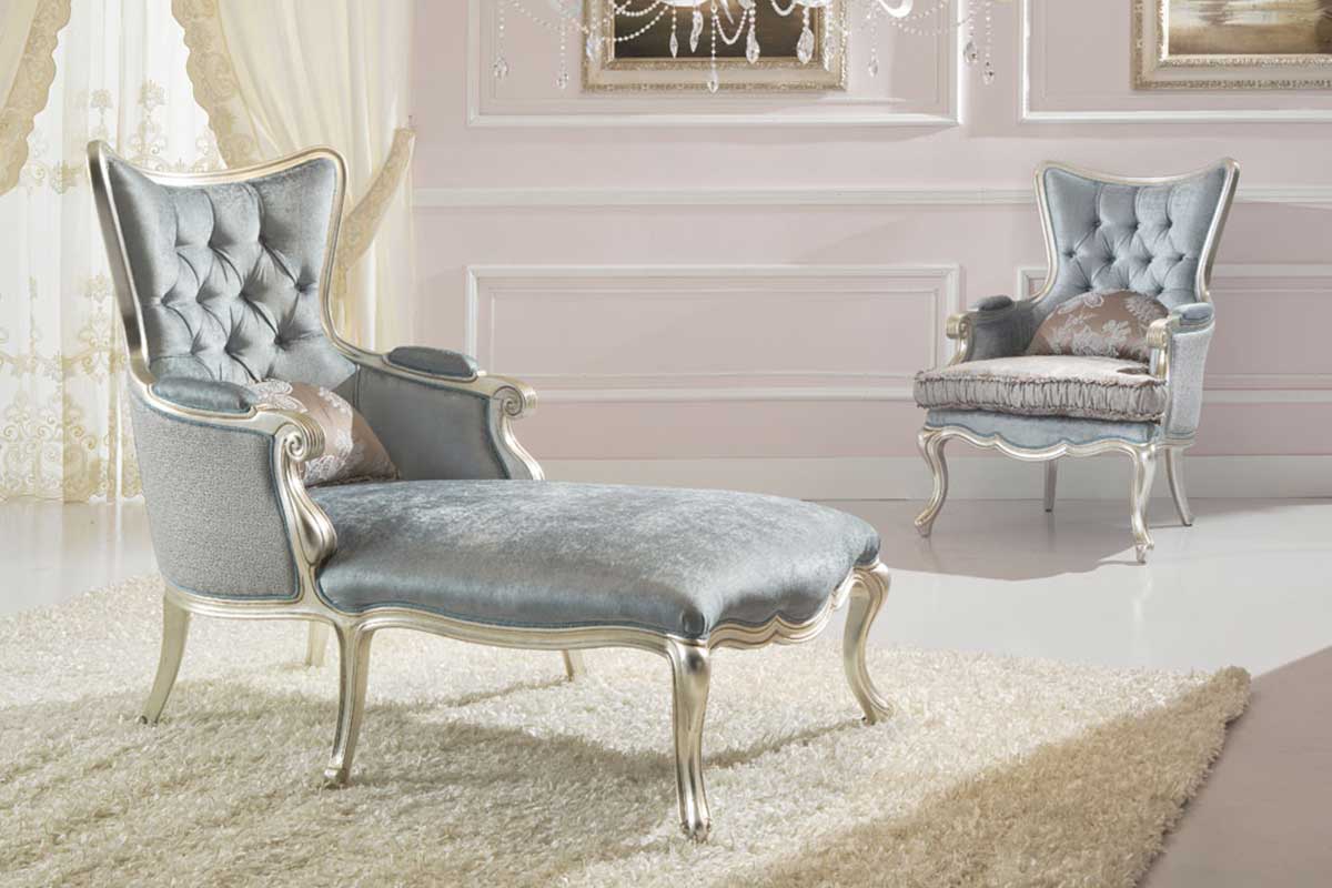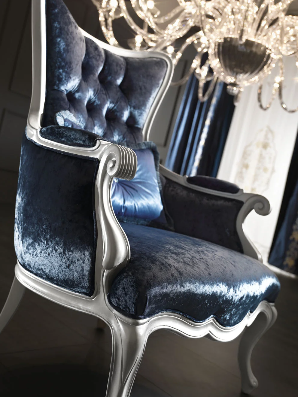 Struttura in legno di faggio pantografata e rifinita a mano. Imbottitura in poliuretano espanso con seduta in piuma d’oca. Per il capitonne’ e le finitura in foglia, considerare la maggiorazione di prezzo come da listino.